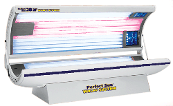 • Introducing the Exclusive Wolff® "Total Body Tanning System". • Featuring a perfect mixture of 24 super-efficient Wolff® high-output 100-watt lamps that shower you with the UV light for a fast, dark "Total Body Tan". • Specially glossed aluminum reflectors enhance the tanning power. • Heavy-duty extruded aluminum and steel mainframe with a durable, long-lasting Polymer exterior housing for easy maintenance and long life. • Easy access acrylic removal system on the canopy and the bench makes changing your lamps and cleaning reflectors easier than ever before. • Exclusively designed acrylic sheet allows the maximum amount of UV penetration for more tanning power. • 3 Super-flow internal fans to keep parts cool and maximize tanning performance. • 20 minute tanning session. • Durable "Motorized" manual timer. • 18-month PerfectSun extended warranty. • Assembled dimensions 87.75" x 35" x 45" • Two! 400 watt face-tanning units to provide full-face coverage. • Wrap around tunnel design surrounds you for a fast, consistently dark, "Total Body Tan". • Wrap around skirt for cosmetic appeal. • Efficient choke ballast utilize only proven technology and have some of the highest success rates in the industry. • A wider, curved seven-foot tanning surface offers all-around tanning in a comfortable resting position. • Seven-foot, staggered lamp design puts more lamps over the facial area for extended tanning coverage. • New LED digital timer. • 120 volt, 30 amp dedicated circuit. • ETL listed.